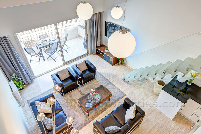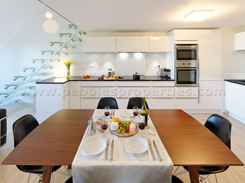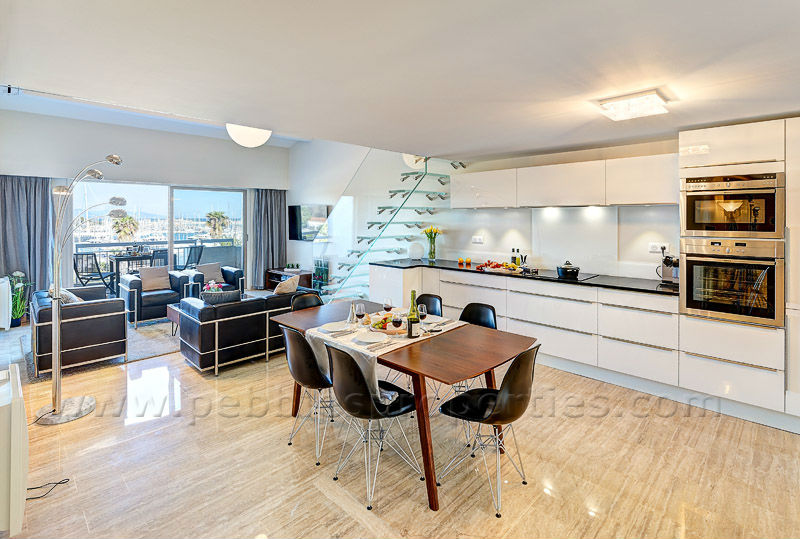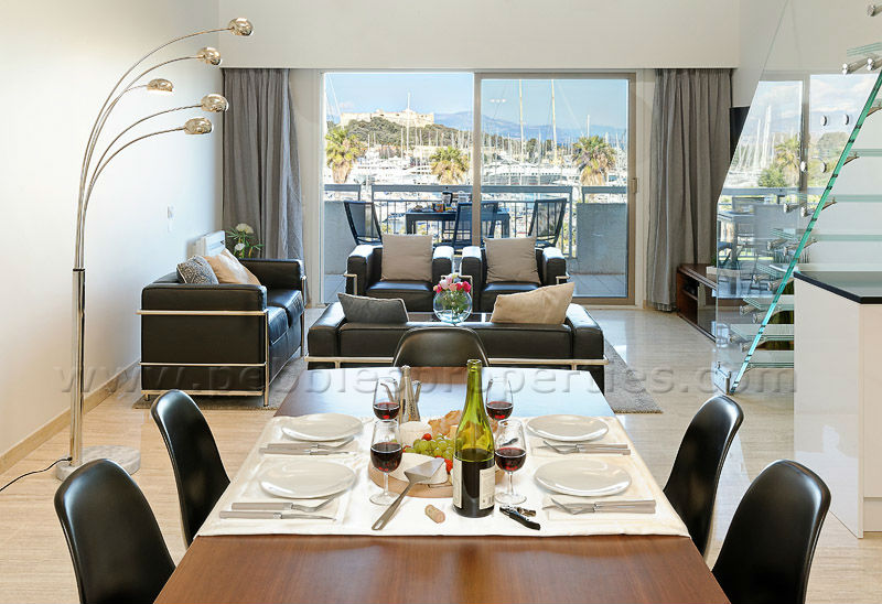The palatial open plan living and dining room benefits from the spectacular view of the port and sea beyond through double sliding doors that open onto the first floor balcony with table and chairs to seat six.