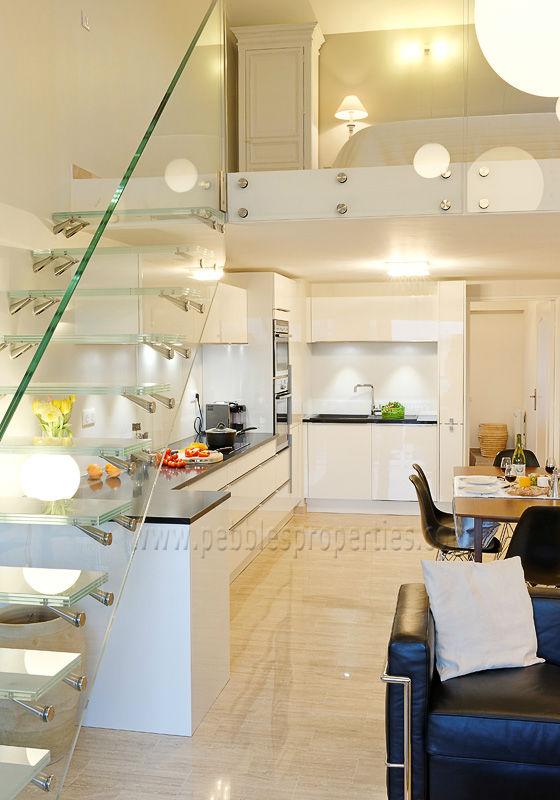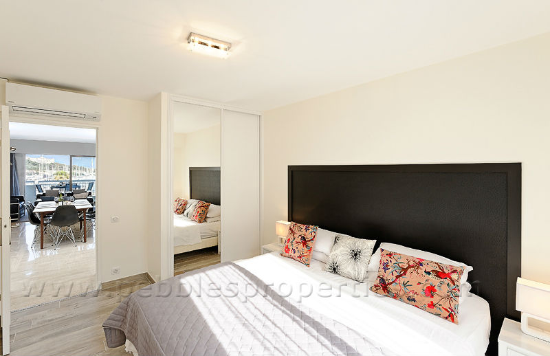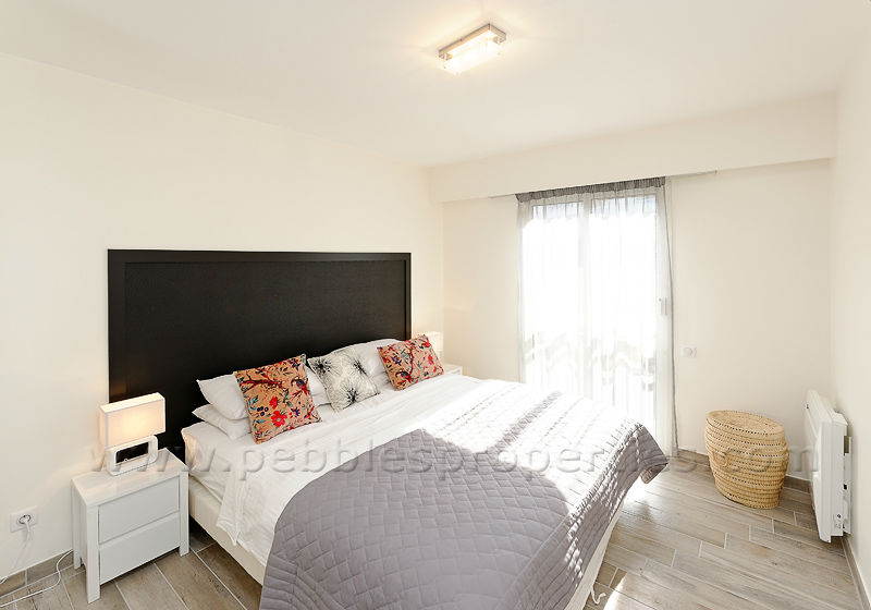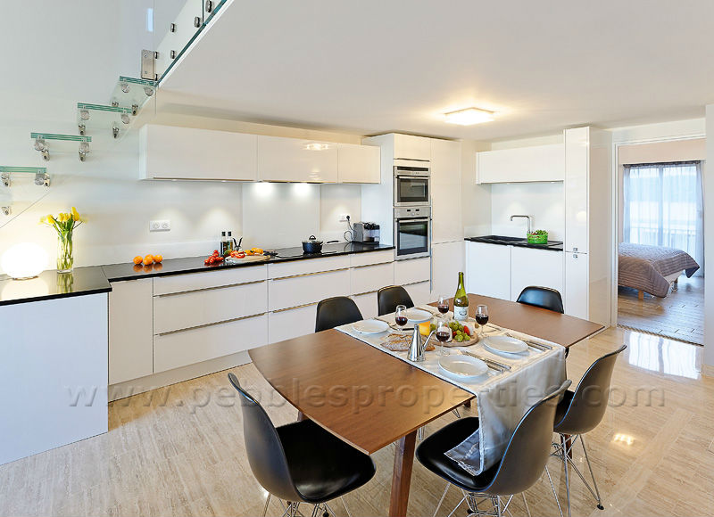 The sleek and contemporary open-plan kitchen is spacious and well-equipped and also comes with a beautiful view of le Fort Carré in the distance. There is a four-ring ceramic hob, oven, microwave, fridge freezer, dishwasher and a washing machine.