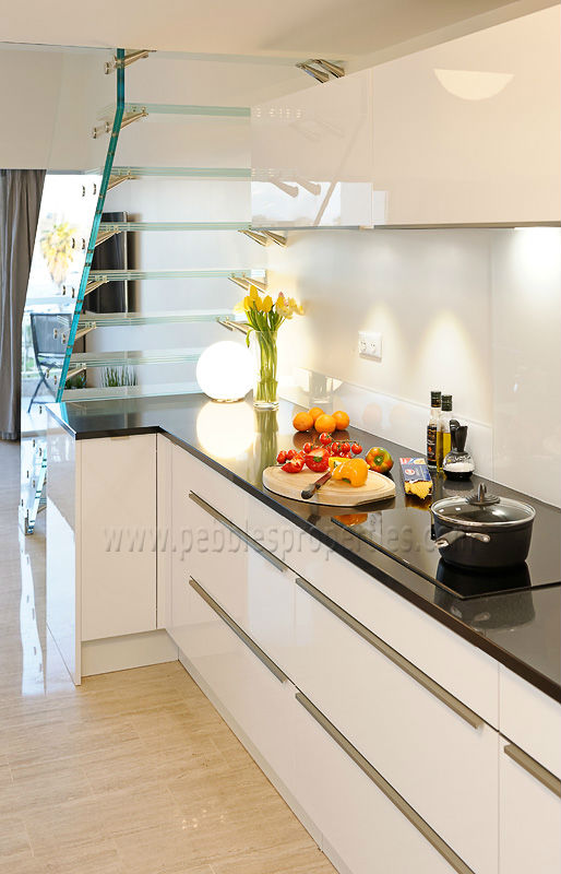 Finished to a very high standard and in a sleek, modern style this area is decorated in tasteful hues of white and light stone grey with equally contemporary furniture. There are two two-seater black leather sofas and two separate single black leather arm-chairs, TV, coffee table and dining table with chairs to seat six.