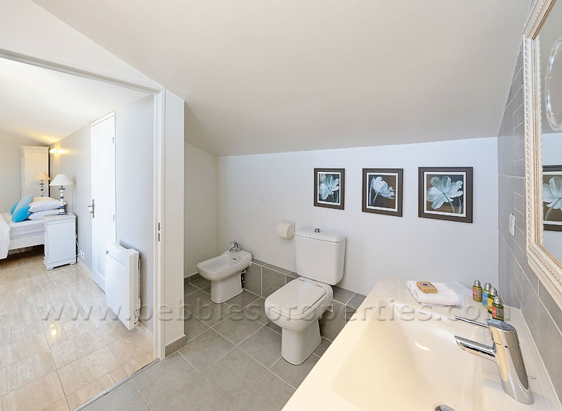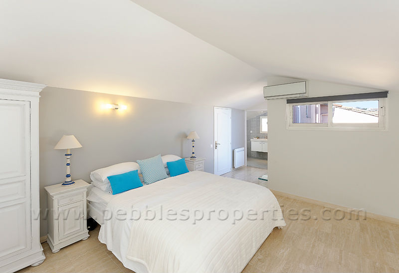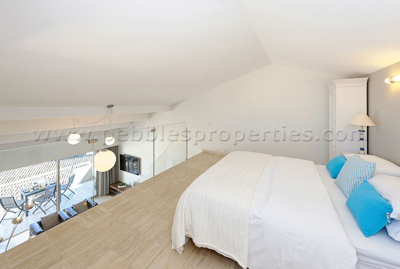 The largest bedroom with ensuite bathroom is located on the generous mezzanine level. Tiled floors, high ceilings and subtle colours of light grey and Azur blue decorate this room. There is a double bed with bedside tables and reading lamps either side and a small wardrobe. It is from here that the roof terrace is accessed.