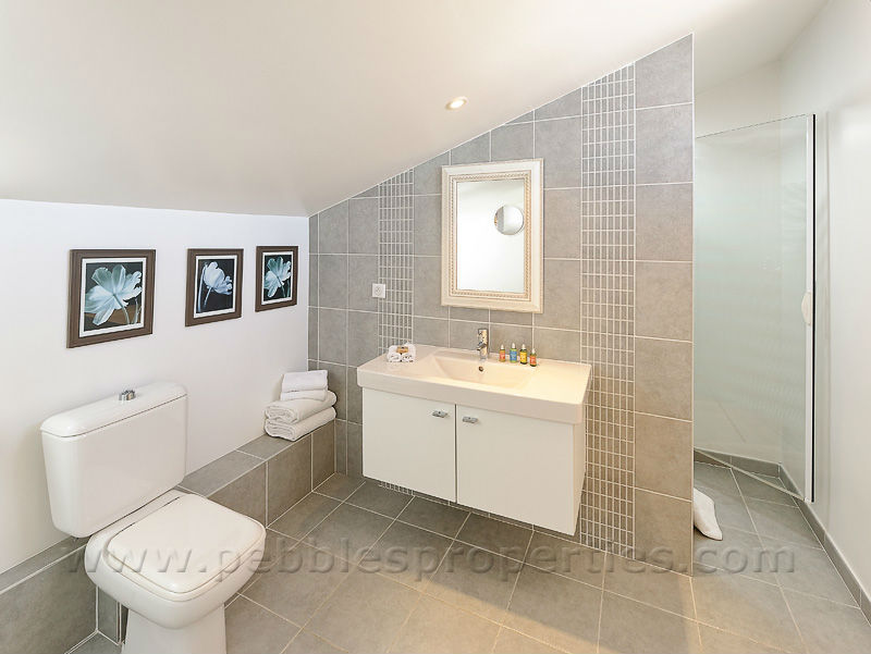 The first of the two bathrooms is ensuite belonging to the main bedroom on the mezzanine level. With a sloped ceiling it houses a toilet, shower and sink unit with a mirror hanging above. It is sleek and modern with grey tiling.