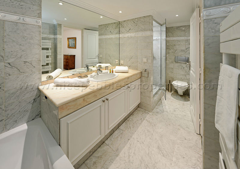 The first bathroom is an ensuite to the larger bedroom, it has been finished in grey marble and holds a bath, separate walk in shower, vanity unity with wash basin and mirror and a toilet.