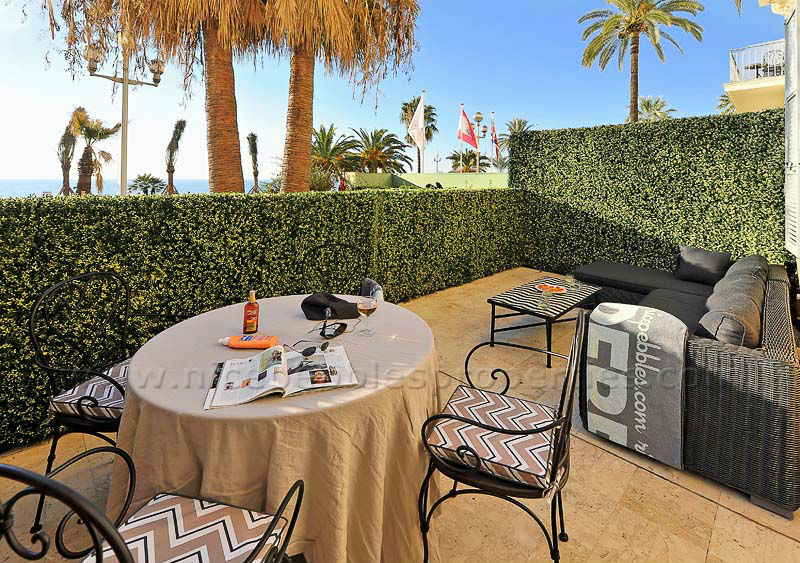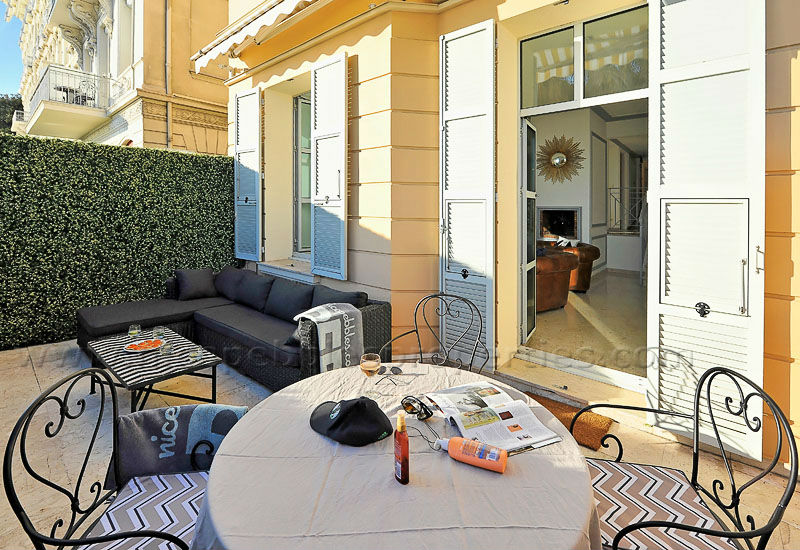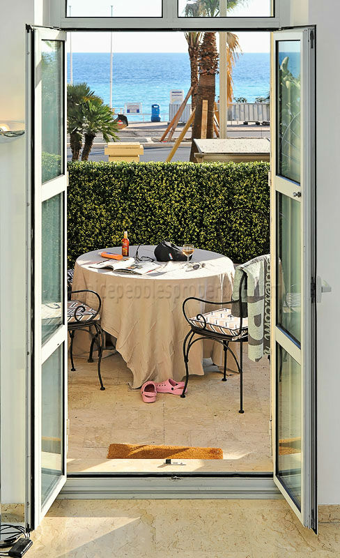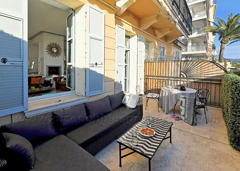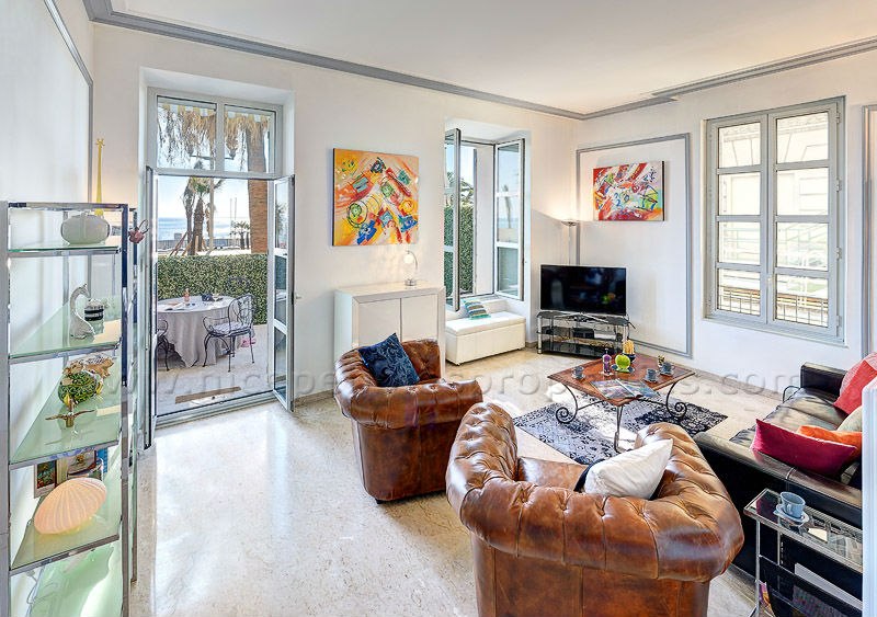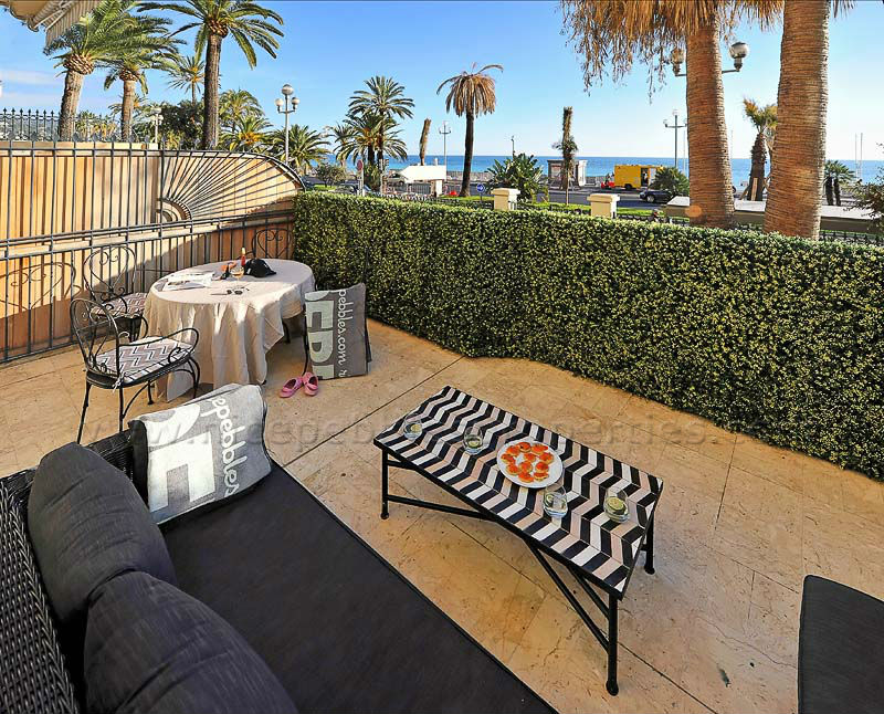 This room provides access to the spacious terrace with beautiful views onto the Promenade des Anglais. There is a table with chairs to seat six and a comfortable lounging outdoor sofa. There's also an additional high table and two chairs on the terrace which the owner added since the photos were taken, so there's plenty of outdoor seating.