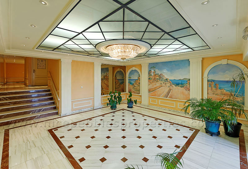 Through the front door of the apartment you descend five steps to reach the living room that is joined to the terrace. High ceilings, marble flooring and traditional art deco cornicing frame this room which has been finished in subtle tones of white and grey.