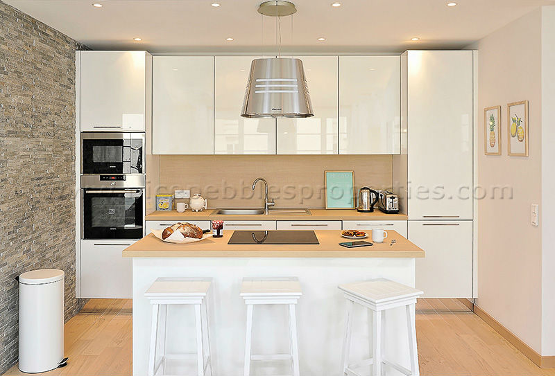 The modern kitchen has been subtly finished to tie in discreetly with the living area. Decorated with clean white lacquered cupboards and a light wood work surface there is full size fridge freezer, four ring hob, oven, microwave and dishwasher.
