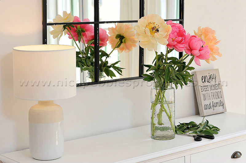 The white dining room table comfortably seats four.