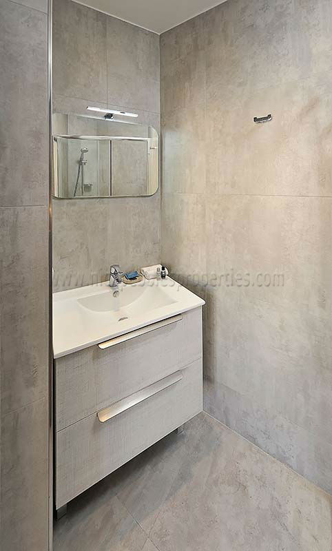 The second ensuite for the second bedroom has been finished with contemporary concrete tiles and holds a walk-in shower, wash basin with mirror and vanity unit.