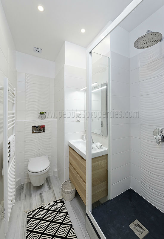 The first and largest bedroom comes with the added bonus of a balcony with a beautiful view of the Coulee Vert park, as well as a Super King Size bed. As well as stylish bedside tables, lamps, drawers and an easy chair, there is also a 40 inch UDH Smart TV(connected to air digital TV), including some English channels. This master bedroom also benefits from the en-suite bathroom with a bath.