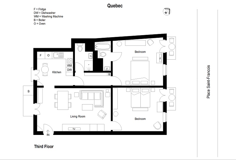 The second bedroom also leads out onto a balcony above the Place St Francois square. The bed is also a Super King Size. There are bedside tables, with drawers, and reading lamps, a large set of drawers, reading lamps and easy chairs and ottomans in both bedrooms, and there’s still enough room in either bedroom for a baby cot if needed.