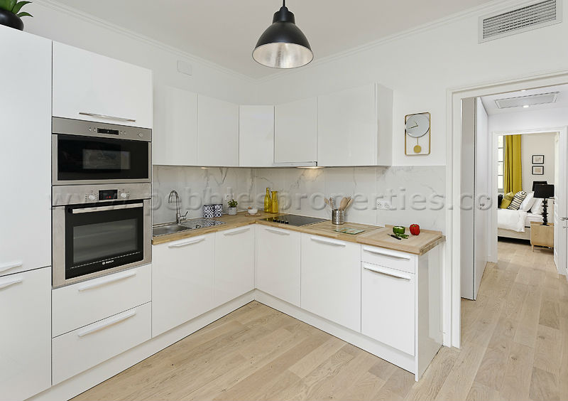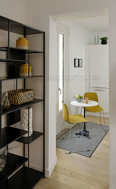 A small table and two chairs have been designed into the space, or guests have the option of the dining table for four in the living area. The owners have equipped the kitchen with all the utensils and tools for rustling up a culinary triumph with the delicious ingredients freshly purchased from the Cours Saleya that very morning.