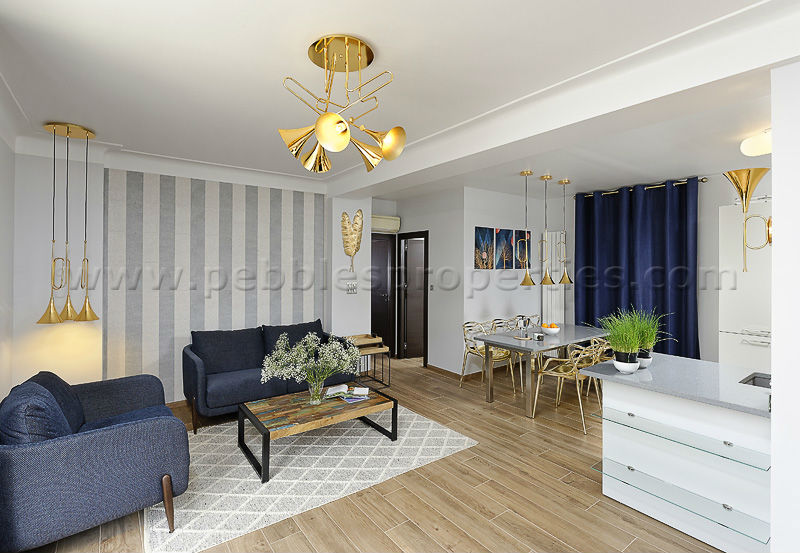 The open plan living, dining and kitchen area is light and airy and stylishly decorated. Statement gold light fittings, chairs and ornaments create a luxurious feel and have been complimented with modern parquet flooring and tones of Riviera blue.