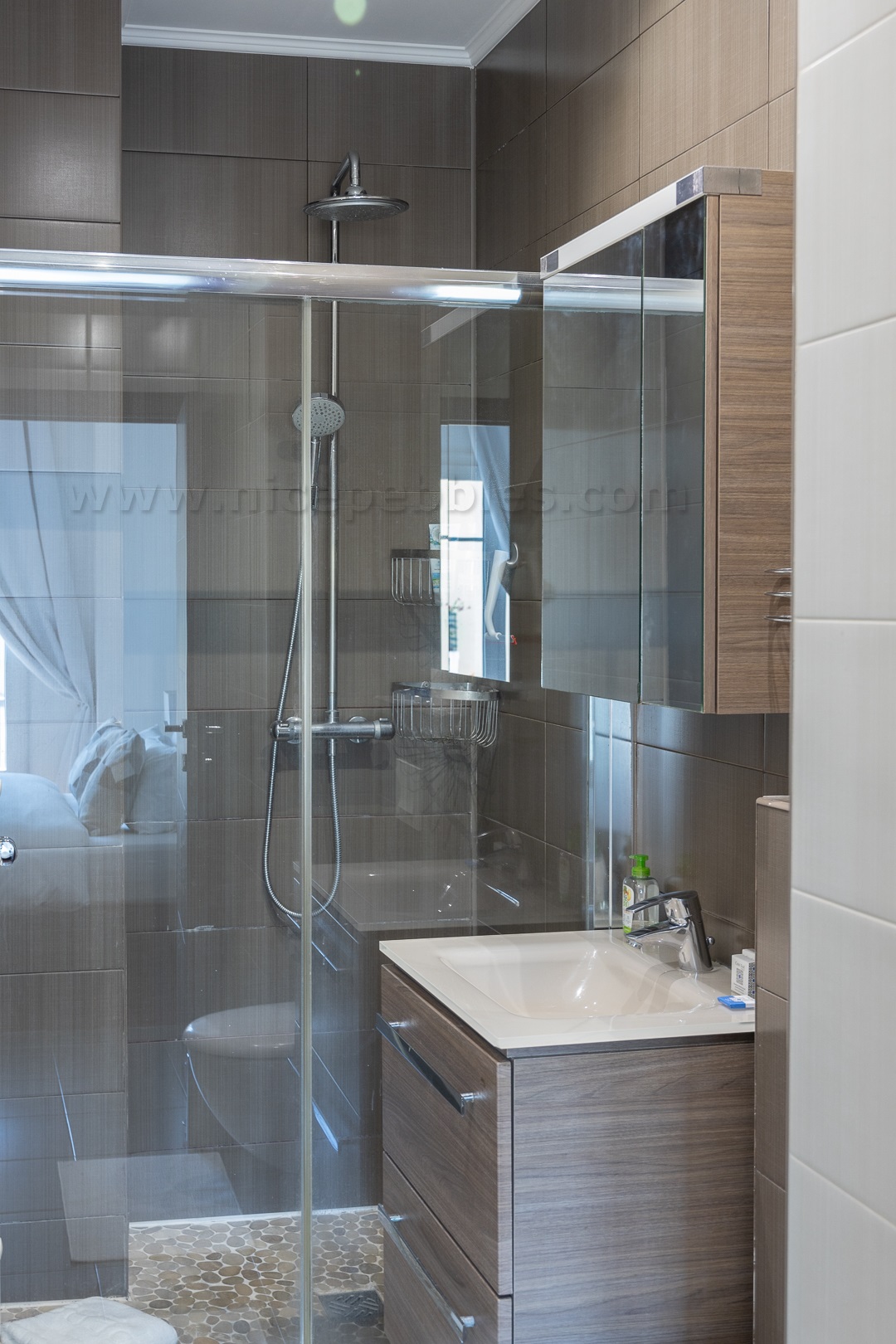 The second bathroom serves the master bedroom as a private ensuite. It has a toilet, wash basin, mirror and walk in shower.